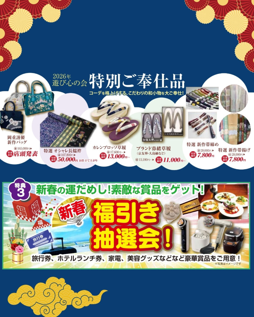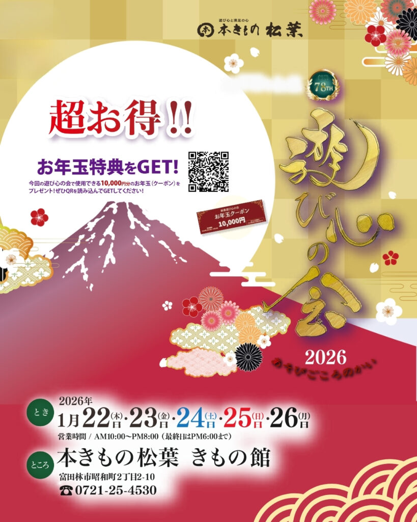 本きもの松葉では、2026年もお客様に福をお届けする「遊び心の会」を、1月22日(木)から26日(月)までの5日間、盛大に開催いたします!
