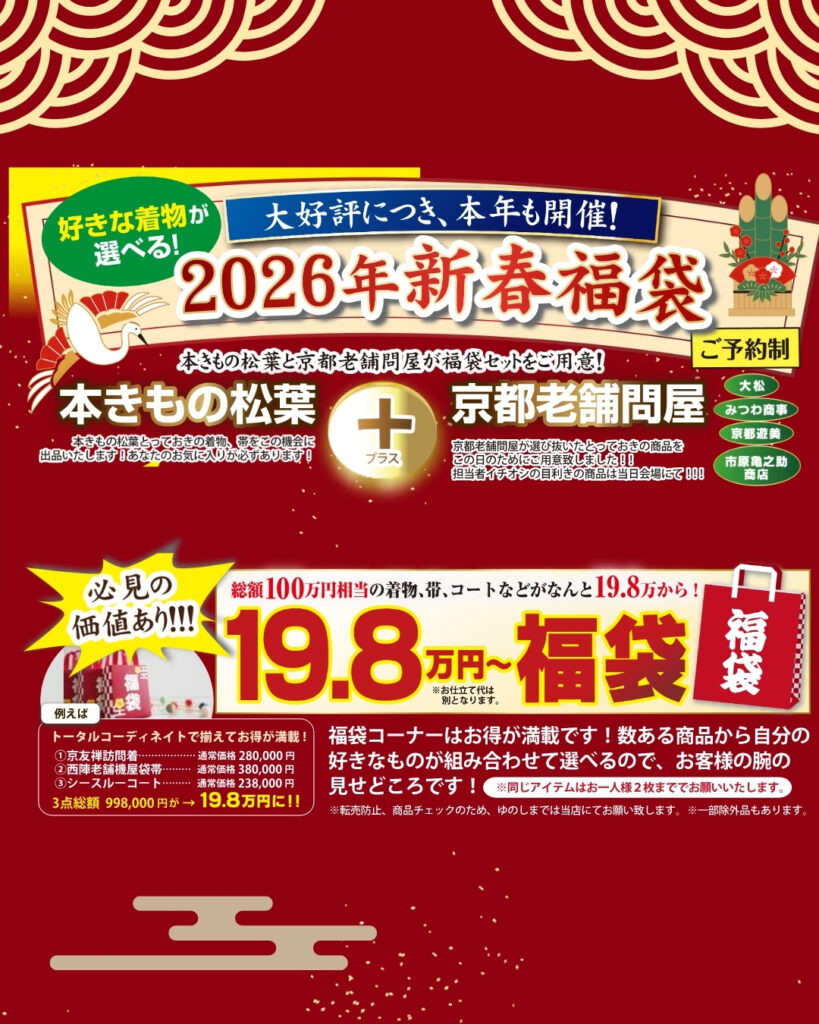 今回の目玉は、本きもの松葉と京都老舗問屋が福袋のためにご用意した特別な企画です。
